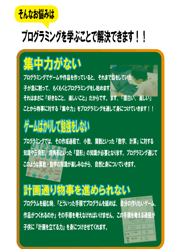 プログラミンを学ぶとプログラミングのスキルはもちろん、それと同時に論理的思考力・創造力・発表力など、どんな仕事でも役立つチカラが身につきます。